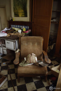 Etant donné que les dépendances encore debout n’avaient pas un grand intérêt, nous nous sommes directement dirigé vers la maison. L’entrée donnant sur un simple couloir carrelé en damier laissait tout d’abord place à une salle qui devait servir de salon, l’endroit avait dû être fouillé. Beaucoup de papiers retournés et les armoires grandes ouvertes… Mais elle laissait place à plusieurs photos du fils militaire, de vieilles plaques chauffantes, et plusieurs vieux fauteuils dont un disposé à tel point qu’il devait laisser juste la place au dernier occupant de gérer ses papiers sur son bureau et sa petite table…