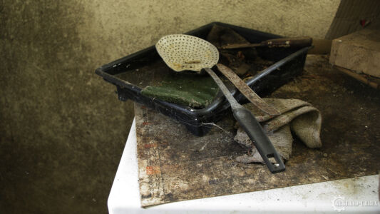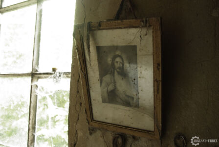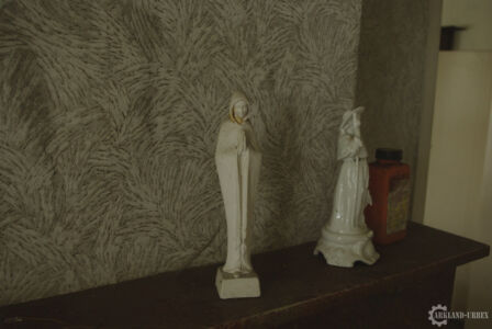 Dans le fond de la pièce, deux portes, une assez basse menant à une cave très glauque et sombre, sans réel intérêt, et l’autre menant à une ancienne salle à manger reconvertie en chambre médicale faute de place dans les vraies chambres. Tout y est resté, jusqu’aux cagots d’échalotes qui ont dû être à moitié mangées par divers animaux qui sont passé par là. Sur la table, deux chapeaux et deux crucifix sont disposés là comme pour montrer quelques signes de la vie des anciens propriétaires. Sur la cheminée, une vierge dans un style qui me fait beaucoup penser au réalisme socialiste veille sur la pièce…