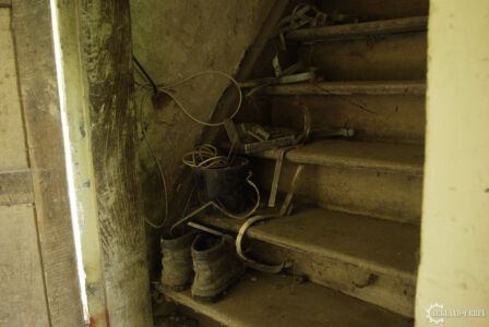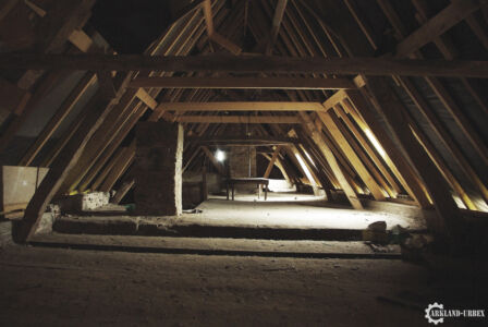 Juste après cette chambre, il y a une seconde porte à gauche qui mène à un grenier, mais celui-ci est malheureusement quasiment vide, on peut juste remarquer que la toiture a été entièrement refaite récemment. Sous cet escalier, une petite pièce, très glauque aussi, qui devait être une ancienne cuisine, ou un endroit pour faire sécher le linge… il est très dur de l’identifier à la vue des casseroles, vêtements, four et autres…
