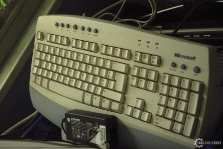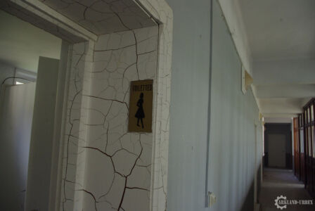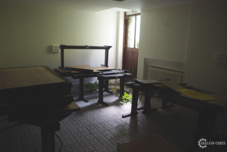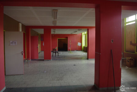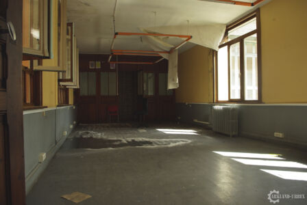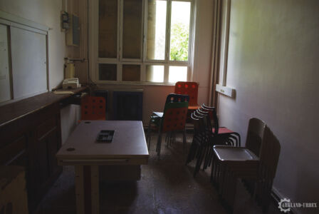 Après être passé un cours moment dans le parc, nous nous retrouvons très facilement à l’intérieur du bâtiment. Le premier aspect que nous avons, c’est qu’il est assez vide mais nous sommes assez vite dans la partie qui m’intéressait le plus, le couloir laissant voir le corridor de l’étage et les premiers bureaux séparés de murs de bois et verres encore dans un bel état. En explorant le rez-de-chaussée, on croise une série de trois pièces complètements fermées de l’intérieur et surement encore utilisées par la municipalité (à mon humble avis), impossible donc d’y entrer sans forcer, et pourtant, ils sont bien garnis niveau objets en tout genre. Par la suite, nous nous retrouvons dans une grande pièce rouge qui devait servir de salle commune, quelques chaises et un tableau noir y sont encore présent, mais sinon le reste est toujours aussi vide. Au fond, une étrange pièce orange recouverte au sol d’un enduit poudreux noir est présent, et, dans un coin, un capharnaüm de pc, pièces et écrans empilés les uns sur les autres.