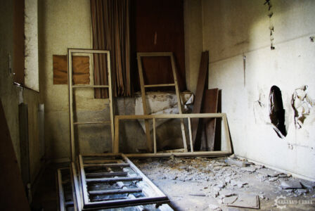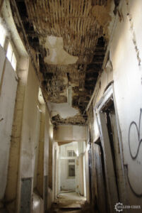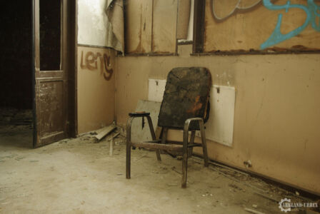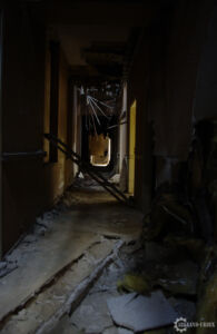 Dans le premier que nous avons visité dans la dernière session faite dans celui-ci, nous avons d’abord exploré le rez-de-chaussé, qui est dans un piteux état mais fait tout de même froid dans le dos. Beaucoup de choses sont détruites, mais quelques traces subsistent, comme la salle d’opération d’un orange flashy horrible, l’ascenseur à la limite du neuf (dans les années 1970), ou divers papiers, pancartes. Le reste est une grosse ruine, l’étage est exactement pareil. Seul les combles réservent des visions plutôt intéressante et photogéniques.