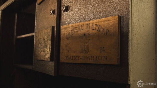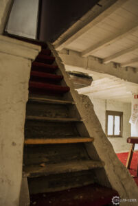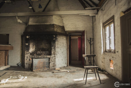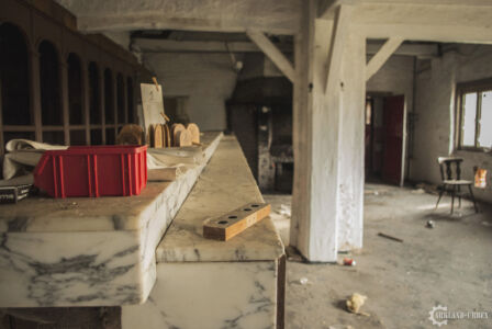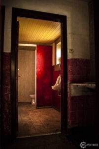 Par l’arrière, le passage est tout frais et clair, une porte grande ouverte donnant sur une grande salle, la principale. L’endroit était partiellement vide mais sans grosse casse, tout de suite à gauche, une grande scène tapissée de moquette rouge avec, devant, quelques petits tabourets et une banderole. En avançant vers le bar, nous voyons des signes d’anciens déménagements, des urinoirs avaient été disposés à terre, mais il s’est avéré qu’ils ne venaient pas du bâtiment en lui-même mais d’ailleurs, car les toilettes étaient bien conservés. Passons au bar, en assez bon état, il devait proposer une bonne variété de spiritueux classés dans des caisses marquées au fer de la marque du vin. Par ailleurs, ils y servaient aussi bien de la bonne bière que la pire… Je vous laisse imaginer. Aucun table n’étaient encore présente mais une des chaises nous laissait voir un autre aspect assez cossu du bar. Il possédait par ailleurs une minuscule cuisine, qui devait servir seulement pour les événements organisés.