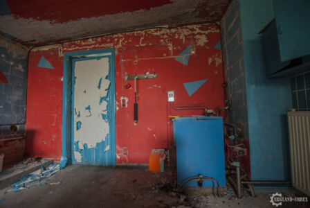 En cherchant de nouvelles pièces à découvrir, je suis tombé sur une porte dans la quasi-véranda donnant sur un premier garage haut en couleurs, tout tapissé de bleu égayé de motifs magenta donné un aspect assez spécial me rappelant mes cours d’art du lycée. Ici, tout y était aussi présent, machine à laver, chaudière,… ainsi qu’une machine ressemblant à une machine à gravure automatique, mais je ne saurai exactement l’identifier.