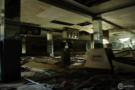 Les trois premières salles (garages ,une autre en bordel et le couloirs autour du moulin) n’était pas intéressantes, complètement vide, juste un petit poster qui s’était perdu là. C’est justement au bout de celui-ci (le couloir) que la joie fut à l’accueil en voyant les restes des pistes de bowling, certes en mauvais état, mais bien impressionnant à voir, avec les vieux écrans, et les interfaces d’une modernité digne du début des années 1990 (et encore).