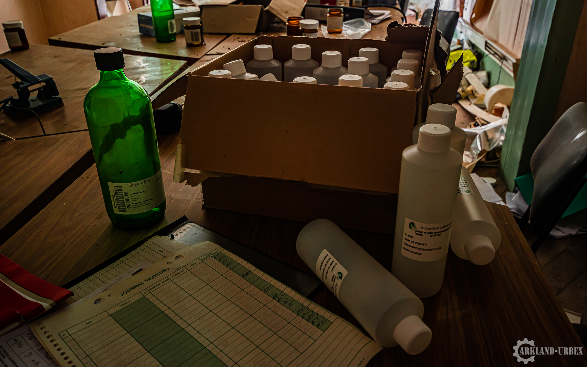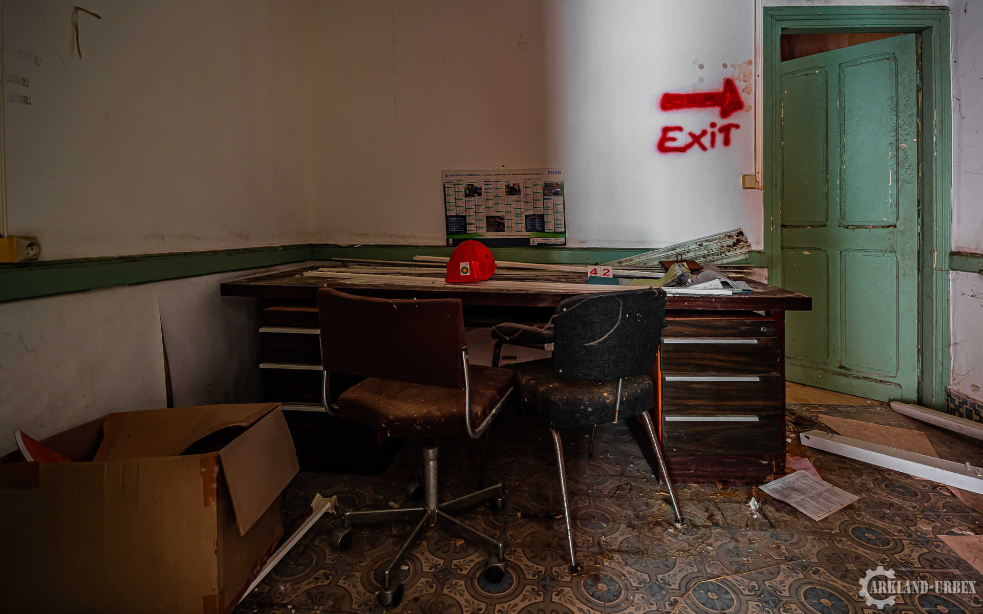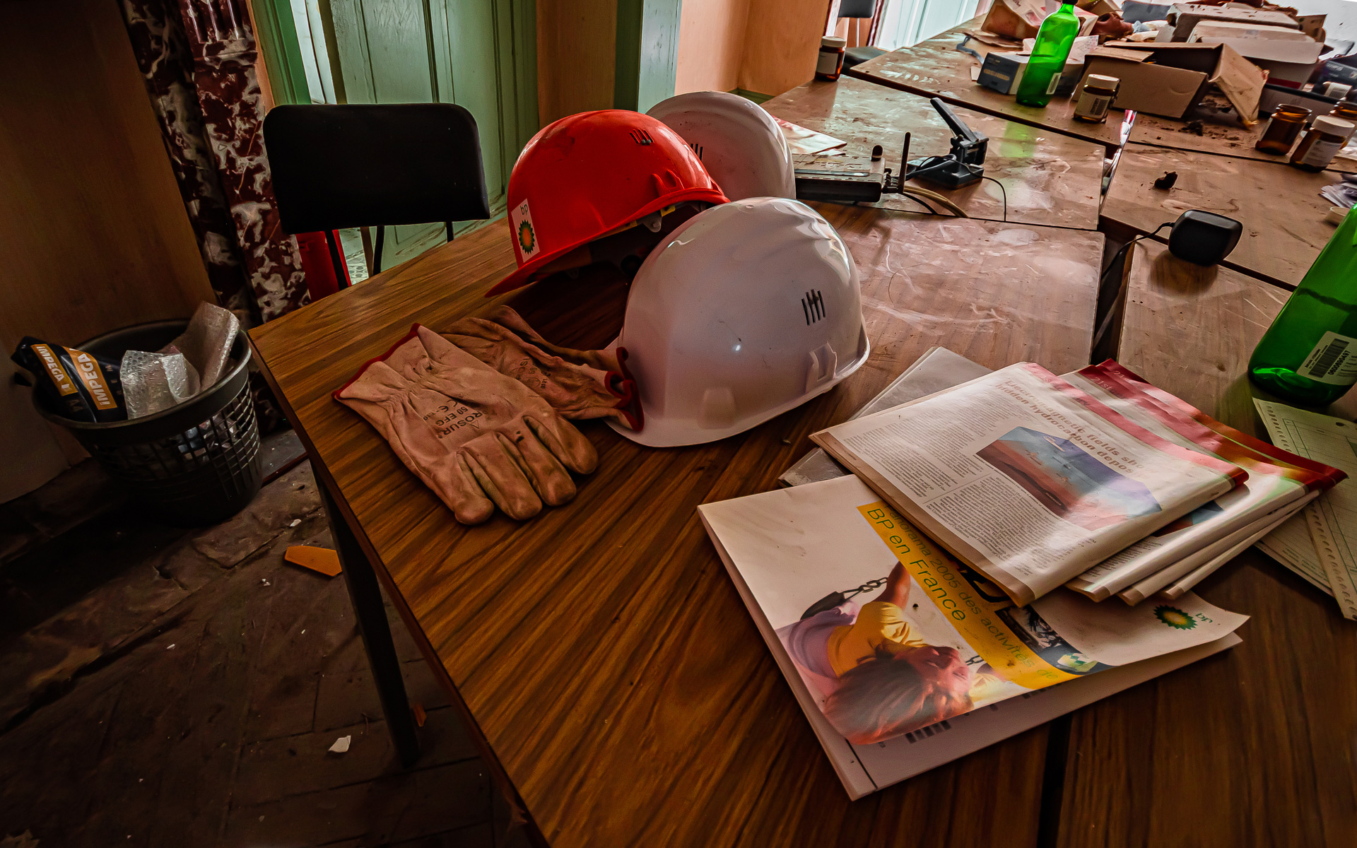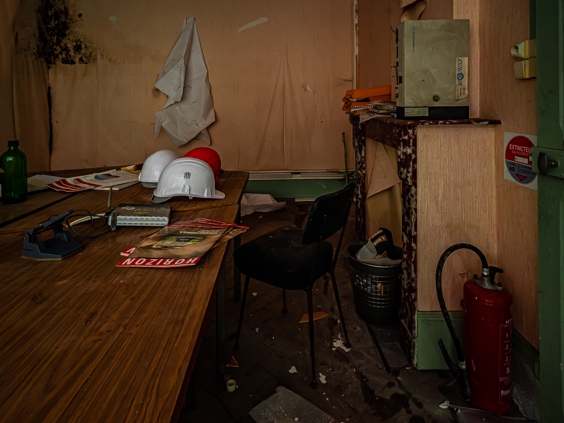 Bien que je ne m’attendais à ne voir qu’une ruine en l’explorant, rien que son entrée ne me donnait pas confiance, pourtant, rien que les deux premières pièces étaient remplies de témoignages des anciennes activités dans cette maison, entre papiers, casques, flasques et autres outils assez uniques. Il était d’ailleurs assez facile d’identifier les pièces, avec une grande salle de réunion au rez-de-chaussée, un poste de travail et une cantine, à l’étage, on pouvait retrouver deux bureaux ainsi qu’une autre salle de réunion plus petite mais très ancrée dans les années 1980. Ce fut tout de même une belle découverte.