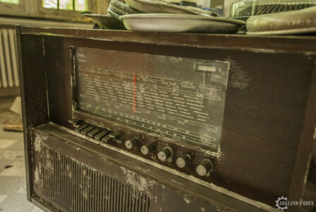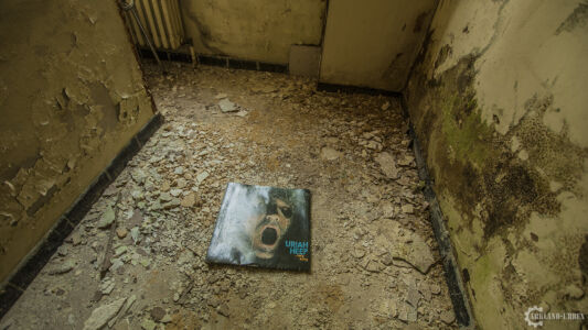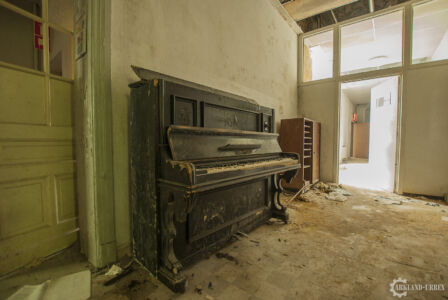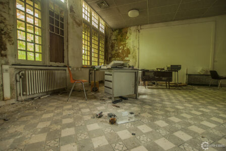 Une fois à l’étage, l’ambiance était toujours aussi sombre et glauque, je passais diverses salles assez vides avant de tomber sur un « embrochement » uniquement garnis d’un fauteuil roulant où un ourson en peluche lassé était posé. Sur la droite se présentait à moi une vaste salle similaire à un très grand salon, où toute la laine de verre et les plafonds s’étaient effondrés. Encore un drôle de spectacle. La partie gauche du bâtiment ne présentait rien de grandement intéressant, seule une salle d’archives plongées dans le noir changeait quelque-peu la chose.