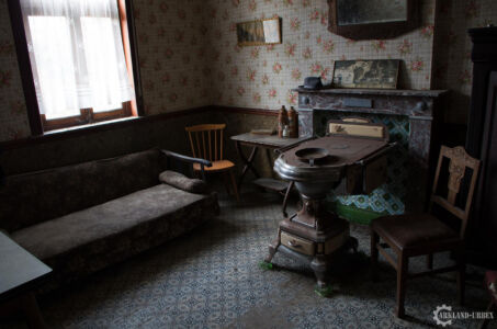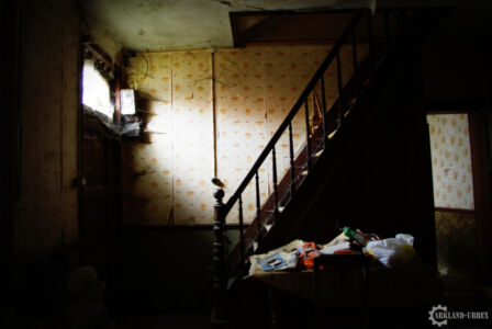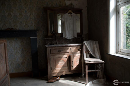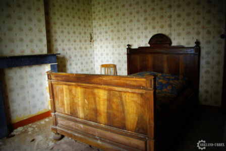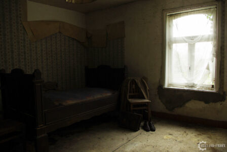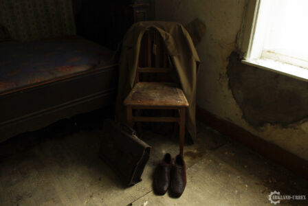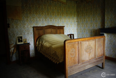 Après cet épisode de maladresse, nous sommes parti à l’étage (envahi par l’humidité, à la vue des tapisseries), et là on a découvert trois chambres, dont deux presque similaires, la troisième n’avait qu’un lit une place, et une chaise avec des vêtements et chaussures de préparé, comme si avant l’abandon, quelqu’un aurait dû se rendre à son boulot. Les deux autres ressemblait plus à de vieilles chambres de couple de troisième âge, avec la petite photo de famille classique sur la table de chevet.