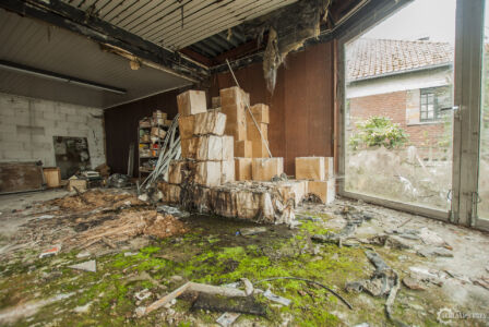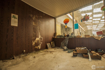 A droite, se trouvait une autre vaste partie vide qui menait, elle, au magasin du garage, juste à côté de la porte coulissante en verre se trouvait un ancien bureau en très mauvais état ainsi que, plus loin, une autre partie d’hangar reconverti en fourre-tout. C’est quand j’ai commencé a explorer la partie qui menait à la boutique que j’ai vu les deux hommes ouvrir la grand porte et mes deux collègues se sont donc enfuis par la sortie à l’arrière tandis que moi, à l’autre bout, je n’ai eu d’autres choix que d’aller directement leur parler pour éviter d’attirer leurs foudres. Fort heureusement pour moi, en parlant un petit peu avec l’un des deux, il m’a gentiment expliqué que je pouvais rester à explorer l’hangar en toute liberté pendant qu’eux débarrassaient quelques objets lourds entreposés.