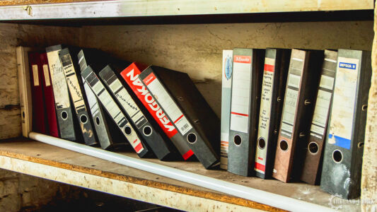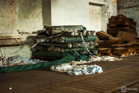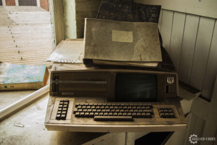 Une fois sur le terrain, ici, le but était de se planquer au plus vite pour ne pas se faire voir par les passants ou les automobilistes. Heureusement pour nous, une porte était grande ouverte. Elle menait directement au stockage des textiles, encore remplis de rouleaux pleins, et pour la plupart encore sous emballage. En continuant sur la longueur du bâtiment, on passe plusieurs pièces de stockage pour arriver directement à une porte menant à de petits bureaux et studio de bricolage. Les bureaux sont malheureusement sans dessus-dessous, mais regorgent de paperasse, de classeurs et vieux calendriers, ce qui nous a permis d’en apprendre beaucoup sur le passé de cette bâtisse. En s’enfonce à travers une dernière porte, on accède directement à un studio de bricolage qui, sur la fin, devait surtout servir à la réparation des ordinateurs.
