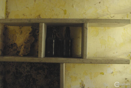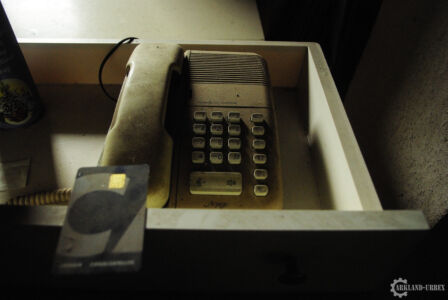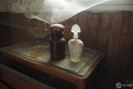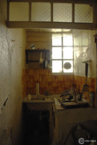 Mais bon, il fallait bien poursuivre. En continuant dans le couloir et en passant à côté de la cuisine, on arrivait sur un petit coin assez resserré ou des objets classiques étaient là, téléphone fixe, manteau accrochés au mur. A droite, la salle de bain, très petite et bien envahie par les toiles d’araignées mais tout y était tel quel.