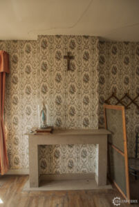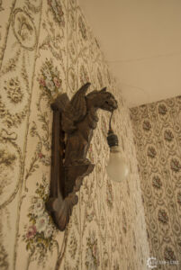 L’étage, au contraire d’en dessous, était très éclairé par une magnifique lumière et était complet. Les trois chambres étaient remplies, dont deux qui représentait de véritables capsules temporelles, avec les anciennes tapisseries, couvertures et meubles. La dernière était plutôt un fourre-tout rempli de chaises, lits, et diverses autres choses. Dans une des pièces d’ailleurs, se trouvait de très étranges lampes représentant de petites gargouilles tout à fait flippantes. Il s’y trouvait aussi une magnifique salle de bain d’un bleu étincelant tout à fait photogénique, malgré qu’elle était assez vide.