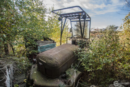 Sur l’avant du terrain, au bord de la route, se trouvait une maison bien délabrée, nous l’avons brièvement visité, vu son état, mais elle présentait une cuisine dans un état de décrépitude bien avancé, ce qui m’a tout de suite plu. Sur l’extérieur, il n’y avait, par contre, qu’un bulldozer et un très vieux monte-charge.