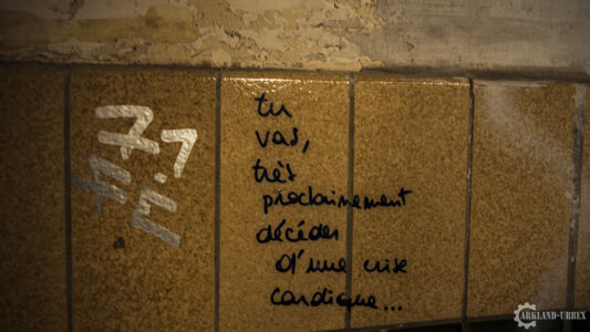 Franchement déçu et saoulé par cette exploration, qui promettait pourtant. Je suis venu au terme d’un problème général dans beaucoup de spots d’urbex (ce qui heureusement est très loin d’être une majorité). C’est que beaucoup, sont enviés seulement et uniquement pour une seule pièce, un objet ou un seul et même véhicule ou centre d’intérêt… Ce qui est triste dans ce sens, mais veridict, car dans ce cas la, les spots ne présentent que ça d’intéressant. Par la suite, je ne développe pas énormément sur la chose, car ce lieu, je l’ai fait et publié (ce qui serait, dans le cas contraire où je voudrais en faire une critique, hypocrite de ma part). Pour en revenir au sujet, le lieu, certes, se laisse apprécier et explorer, c’est grand, vaste, il y a de beaux tags, mais c’est vide… On ne peut pas vraiment s’attarder sur une pièce ou une fresque, on passe vite fait d’une pièce a l’autre. On ne peut pas non plus s’attarder sur l’architecture du bâtiment, qui semble bâclée et pauvre. Et pourtant, c’est bel et bien la même que celle de la Villa Cavrois, dans cet ouvrage, on ressent quelque chose, c’est complet, ouvert, cohérent et beau a observer. Malheureusement, ici, je n’ai réellement pas réussi a être comblé par l’architecture du bâtiment… Dommage.